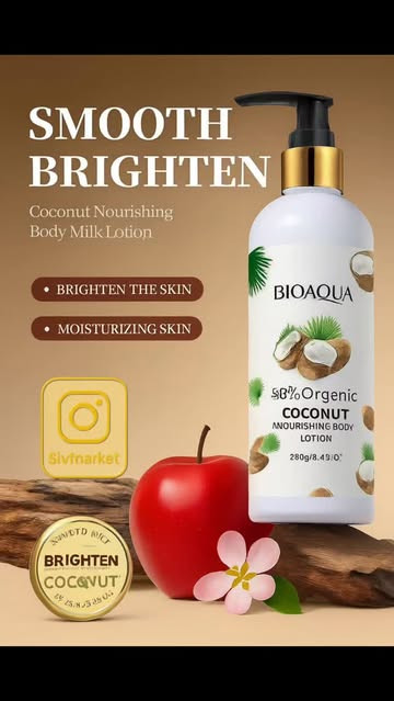 پوستت رو با قدرت نارگیل ارگانیک بیدار کن! محصول ویژه فروشگاه sivmarket – لوسیون بدن BIOAQUA با ۹۸٪ ترکیب ارگانیک مشخصات فنی: حجم: 260g / z فرمولاسیون غنیشده با نارگیل طبیعی و برگهای سبز پمپ طلایی با طراحی لوکس و استفاده آسان مناسب برای انواع پوست، حتی پوستهای خشک و حساس خواص بینظیر: عطر دلانگیز: بعد از استفاده، پوستت رایحهای طبیعی و خوشبو خواهد داشت لطافت و نرمی: کاهش زبری، نرم کردن کوتین و صاف کردن سطح پوست روشنکنندگی: حذف تیرگیها و روشنسازی طبیعی پوست طراحی سهبعدی با سیب سرخ و شکوفههای زیبایی، نماد طراوت و اصالت مهر ORIGINAL تضمین کیفیت و اصالت محصول فقط در sivmarket – جایی که زیبایی با اعتماد همراه میشه برای و مشاوره تخصصی، بده BIOAQUA